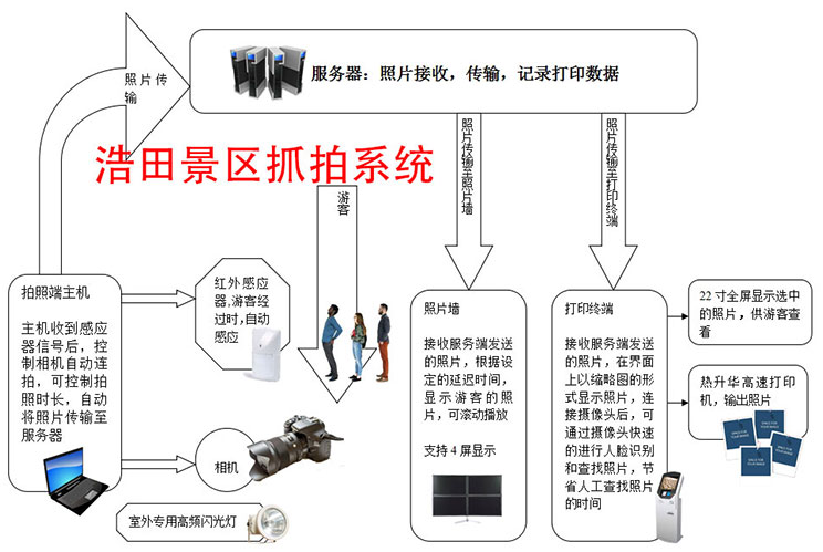 1,自助打印,只要游客經(jīng)過特定區(qū)域,就會觸發(fā)拍照系統(tǒng)進(jìn)行快速抓拍。并上傳到云端,另一端實現(xiàn)自助打印。